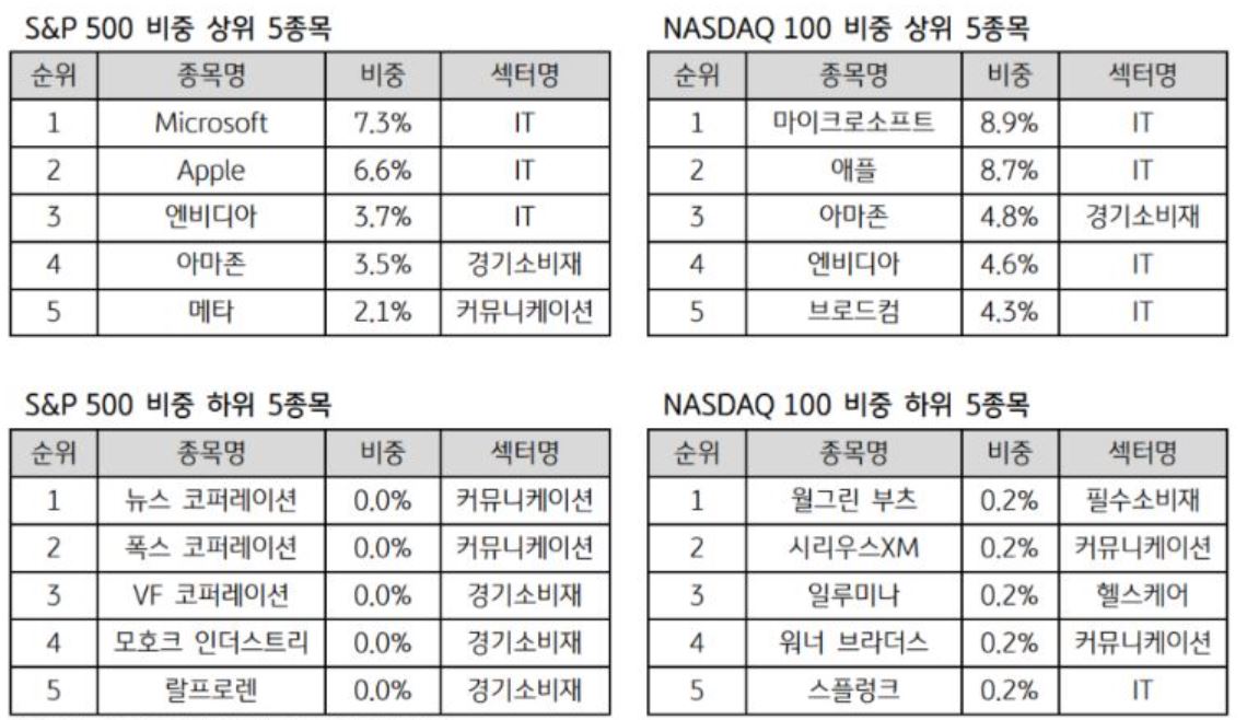 S&P 500 지수는 업종에 상관없이 미국에 상장된 시가총액 상위 500개 기업을 선정해 구성한 주가지수이며 미국을 대표하는 주가지수로 가장 많이 활용되는데 이유는 500 종목의 시가총액 합이 미국 전체 주식시장의 약 80%를 차지하기 떄문입니다. S&P 500 지수가 미국 경제의 전반적인 성장성을 나타낸다면, NASDAQ 100 지수는 조금 더 기술 산업의 성장성에 초점이 맞춰진 지표라고 할수 있습니다.